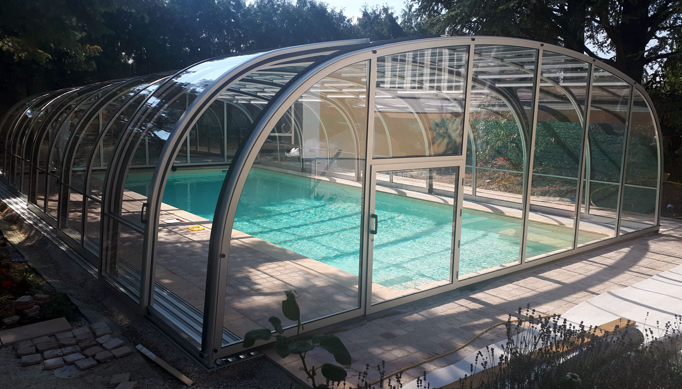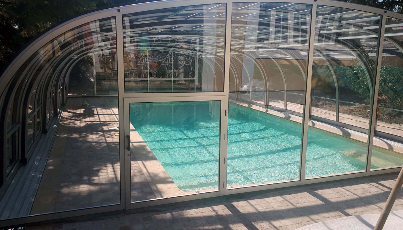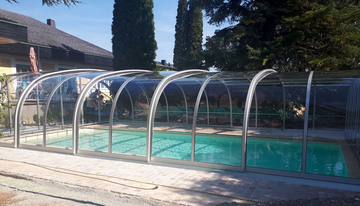Einseitige Schienenkonstruktion. Aufkantung für die Poolumrandung bei der Vorderwand, kindersicheres Schließsystem der Segmente, individuelle Segmentaufteilung, Erhöhung der Bogenhöhe, Aluminiumstabwerk in individuellen RAL-Farben, Motorantrieb.
