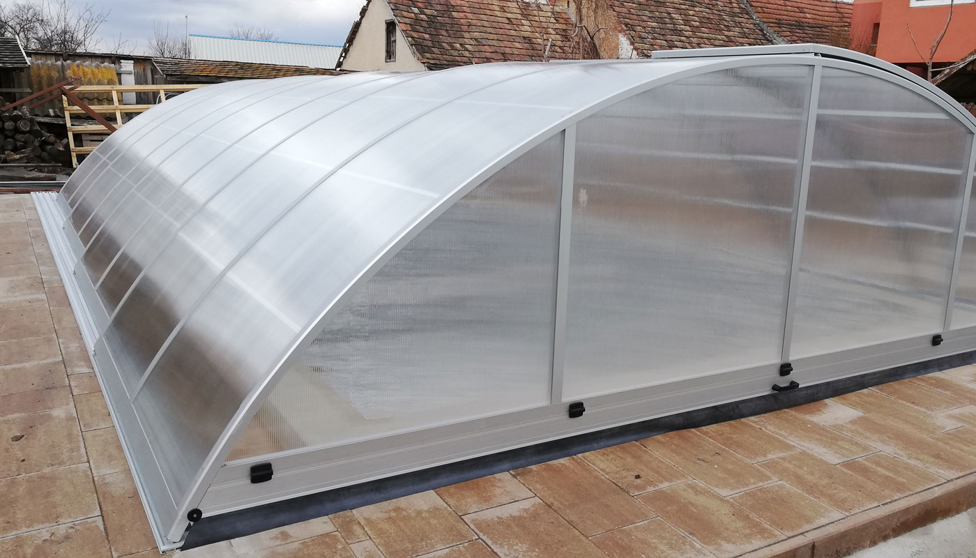 Moderne, superflache, eckige Poolüberdachung ohne Tür mit 4 mm massiver, wasserklarer Polycarbonatverglasung. Im Interesse der Vorbeugung der Um Unfällen vorzubeugen, verfügen unsere patentgeschützten Profilsysteme über abgerundete Kanten und Eckpunkte. Ihre Höhe liegt zwischen 0,4 und 0,8m, abhängig von der Breite.