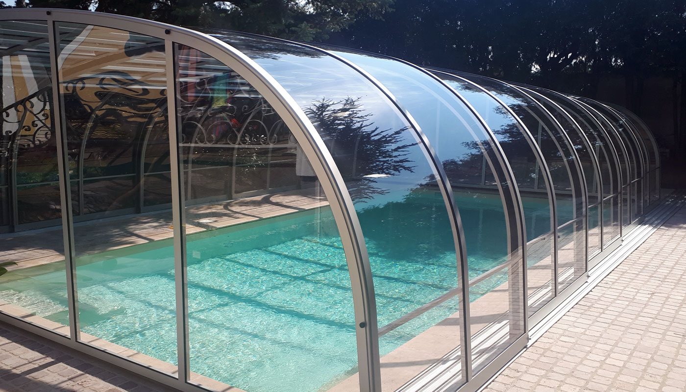 Einseitige Schienenkonstruktion. Aufkantung für die Poolumrandung bei der Vorderwand, kindersicheres Schließsystem der Segmente, individuelle Segmentaufteilung, Erhöhung der Bogenhöhe, Aluminiumstabwerk in individuellen RAL-Farben, Motorantrieb.