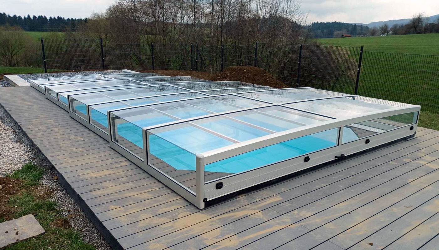 Moderne, superflache, eckige Poolüberdachung ohne Tür mit 4 mm massiver, wasserklarer Polycarbonatverglasung. Im Interesse der Vorbeugung der Um Unfällen vorzubeugen, verfügen unsere patentgeschützten Profilsysteme über abgerundete Kanten und Eckpunkte. Ihre Höhe liegt zwischen 0,4 und 0,8m, abhängig von der Breite.