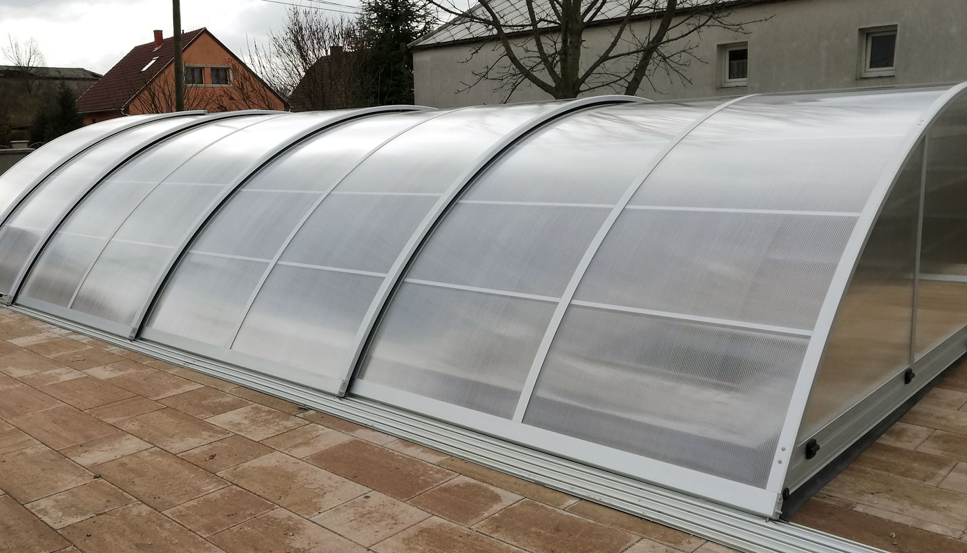 Moderne, superflache, eckige Poolüberdachung ohne Tür mit 4 mm massiver, wasserklarer Polycarbonatverglasung. Im Interesse der Vorbeugung der Um Unfällen vorzubeugen, verfügen unsere patentgeschützten Profilsysteme über abgerundete Kanten und Eckpunkte. Ihre Höhe liegt zwischen 0,4 und 0,8m, abhängig von der Breite.